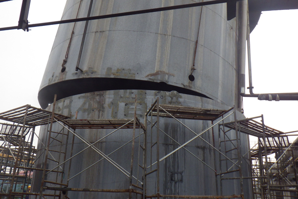邢台某焦化厂的一个粗苯槽罐,由于罐体陈旧存在安全隐患,需要整体切割拆除后更换新罐。罐体直径11m,壁厚10mm,内部尚有大量粗苯残留物,底部杂质较多,清理困难。