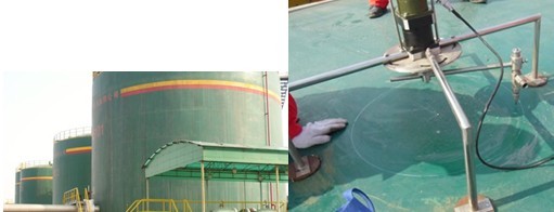 该厂区布满罐体严禁任何易燃易爆点 辅助切割器运抵罐体顶部,由软管连接的主机系统则在几十米下的地面