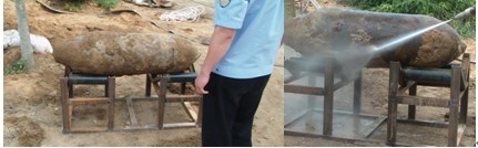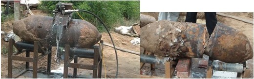 2010年5月石家庄处发现一枚未爆航空炸弹,因长时间埋于地下已经严重腐蚀,弹体上已无任何明显标志,里面全部全是TNT(烈性炸药),两端各有一个引信,其爆炸威力巨大。石家庄市公安局为了安全起见,同时为了不影响居民,经过大量考察最终决定和我公司展开合作,首次采用便携式水切割系统进行处理,由排爆专家和锐迅安防公司技术人员协作采用自主研发的炮弹切割设备对航弹进行整体环切,成功将航弹钢制壳体和内部TNT炸药同时切开。此次对航空炸弹的销毁是全球首次对航空炸弹实施野外水切割销毁,实战效果得到良好体现。